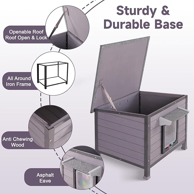 - 【Sturdy Cat House Base】Our outdoor cat house is constructed with solid wood and a metal frame. The fully enclosed metal frame is designed to prevent chewing and damage by pets. The use of durable materials ensures that the cat houses for outdoor cats is long-lasting and provides a safe and warm shelter for cats, dogs and other animals.