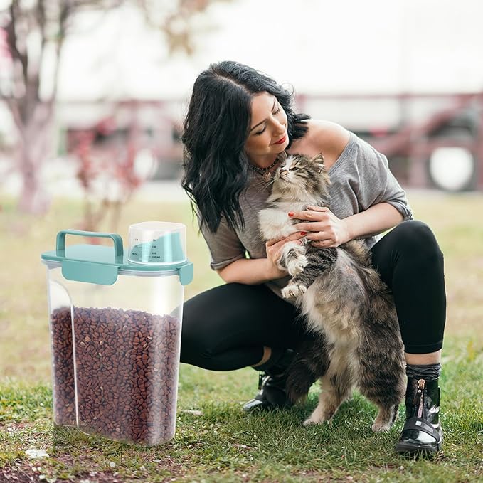 5-7Lbs Dog Cat Food Storage Container with Upgraded Large Nozzle BPA-free, 4 Snap Seals Plastic Pet Food Storage Containers with Handles (1, Elegant Blue, 5L)