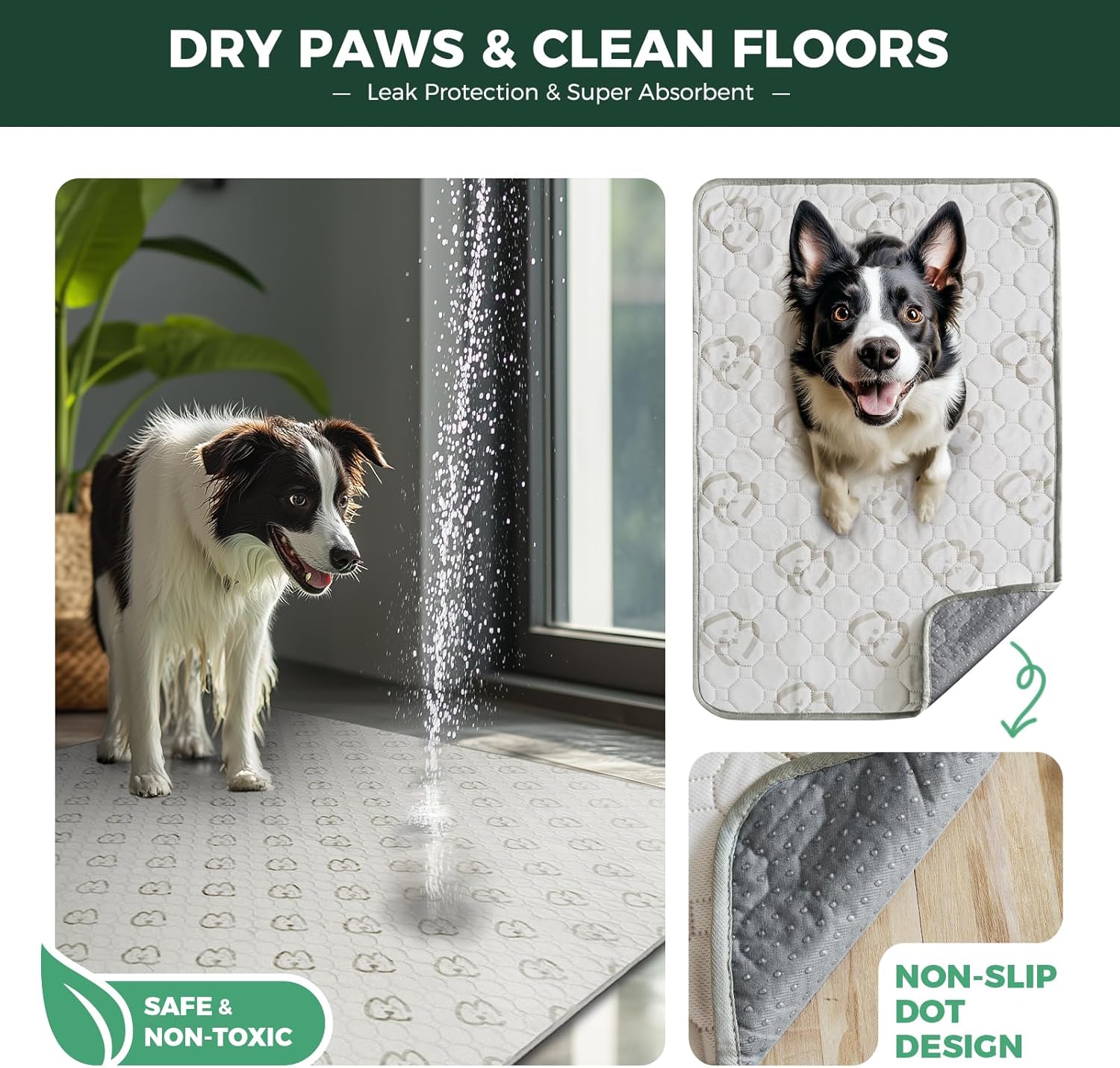 - Super Absorbent: Our dog pad absorbs up to 2L of liquid with a thick, heavyweight cotton layer — perfect as a dog playpen mat to keep your pup’s space clean and dry all day.