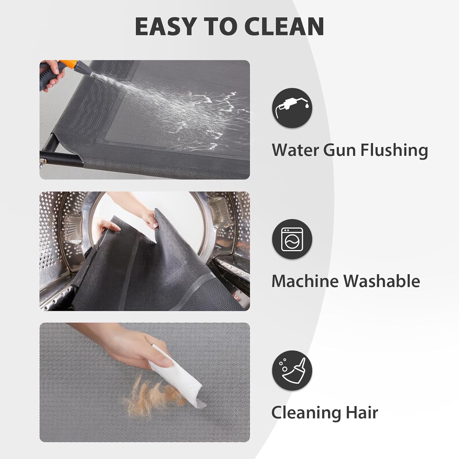 - 【DOG BED EASY CARE】: This cooling elevated dog bed is super easy to clean. Pet hair, vomit, and dust can be quickly wiped away, or you can wash the mesh with tap water, a hose, or a damp towel. For a deeper clean, use mild soap or natural cleaning agents. No more worries about pet odors, dirt, or excessive hair. (Note: Wash the U-shaped pillow separately with pet shampoo.)