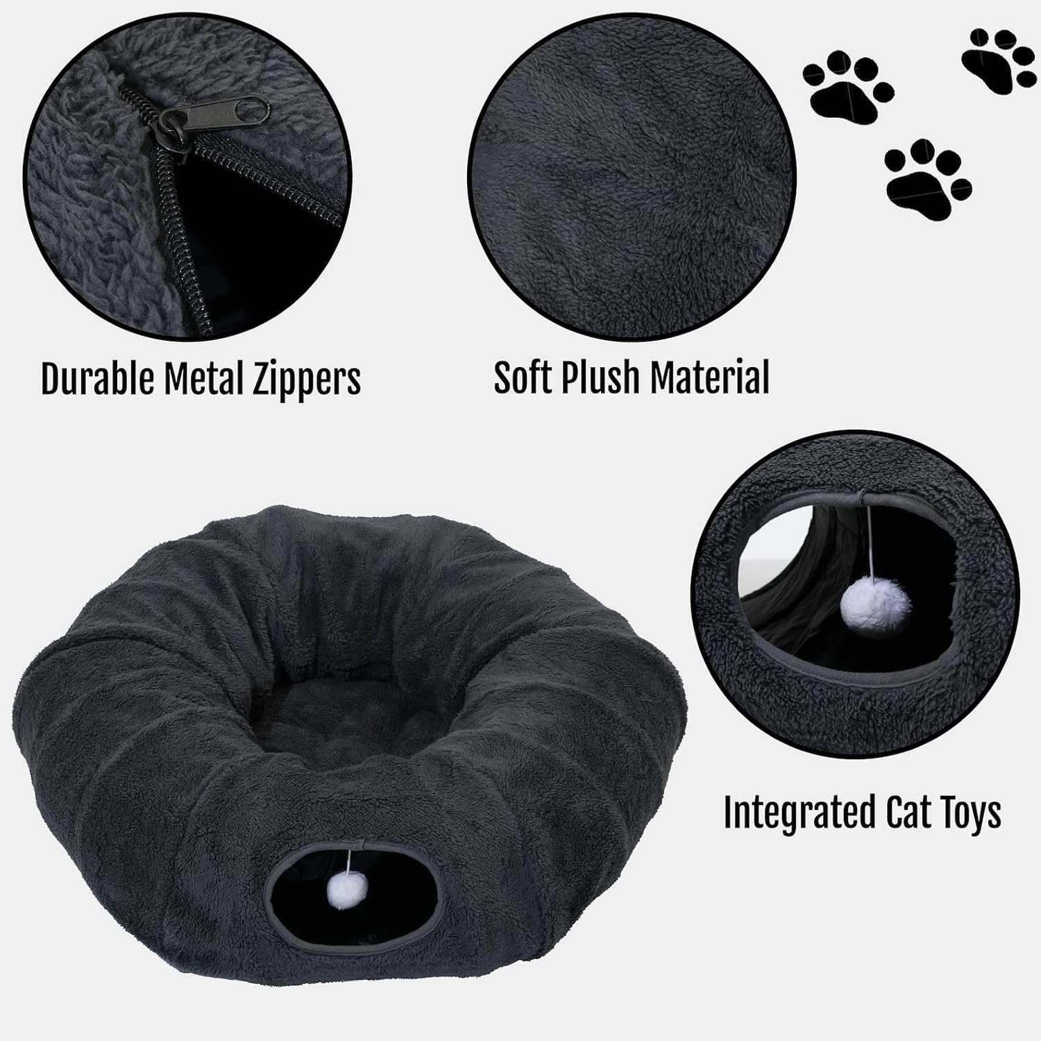 R1M Cat Tunnel Bed for Indoor Cats, Cute Cat Donut Tunnel Toys for Small, Larger Cats with Two Fish Cat Toys, Round Pet Peekaboo Cave Toy for Kitten, Dark Grey