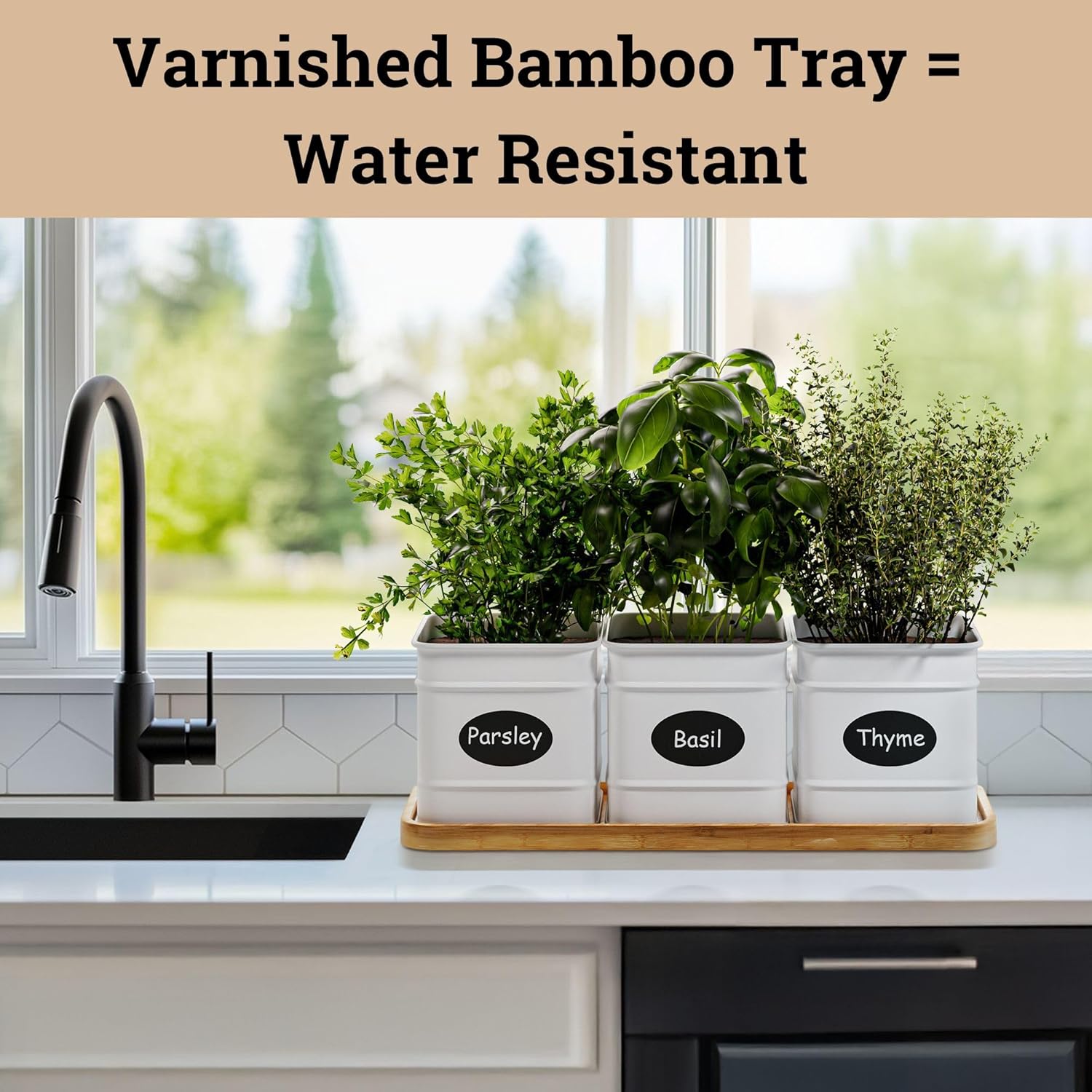 Herb Planter Indoor - 3 Iron Herb Pots with Drainage Holes, Varnished Bamboo Tray, Customizable Labels & Marker Pen - Indoor Herb Garden Planter - 3 Pots for Herbs - Inside Spice Garden - Basil Pot