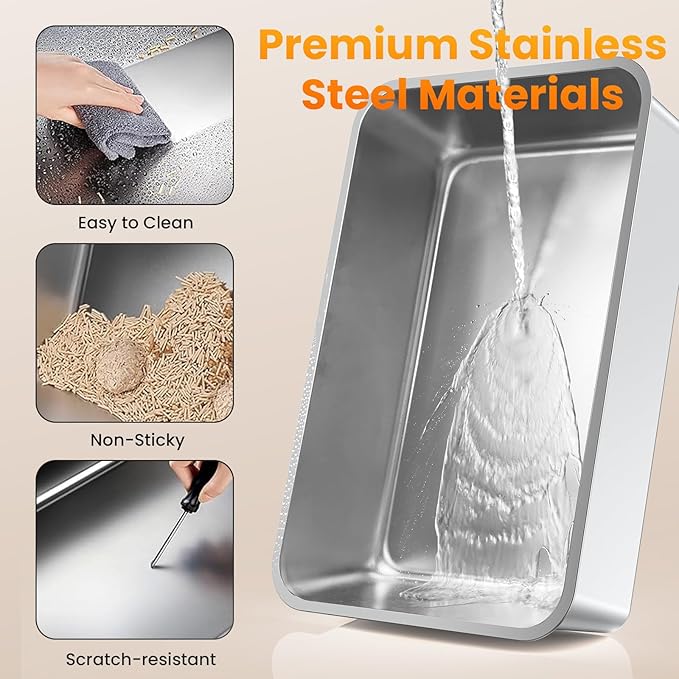 - Premium Stainless Steel: The bottom basin of metal litter box is made of sturdy 201 stainless steel, which lasts longer than ordinary plastic cat covered litter boxes, not deform, smooth non-stick surface and easy to clean.