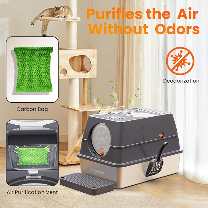 - Odor-Free: The carbon bag at the top vent of the stainless steel litter box effectively absorb odors, which keep your space clean and fresh.
