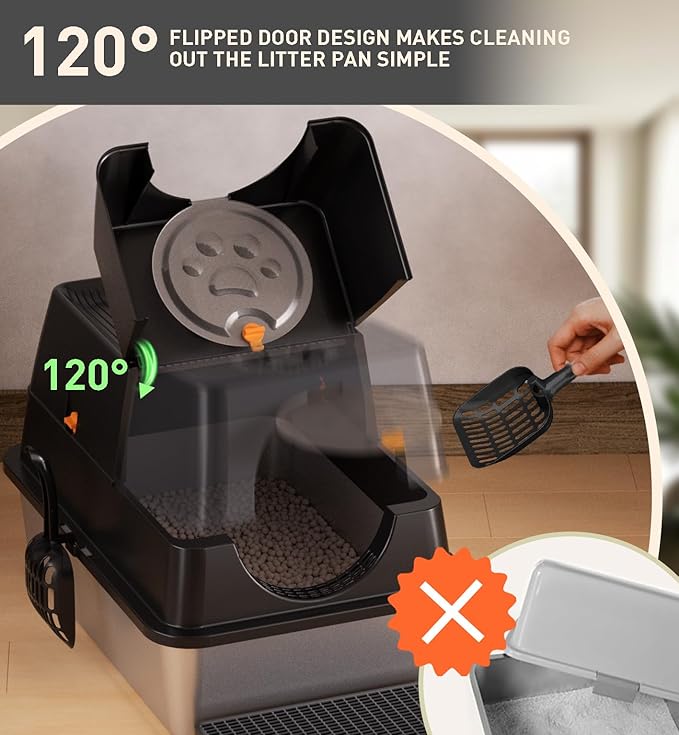- 【Easy to Clean & Durable】The 120-degree flip door design makes cleaning the litter pan simple and hassle-free. You can easily flip the door open to clean the box without removing the entire cover. Made from premium stainless steel, this litter box is non-stick and easy to clean with just a quick wipe. Its sturdy construction ensures a service life of 3-5 years, making it a perfect choice for long-term use.