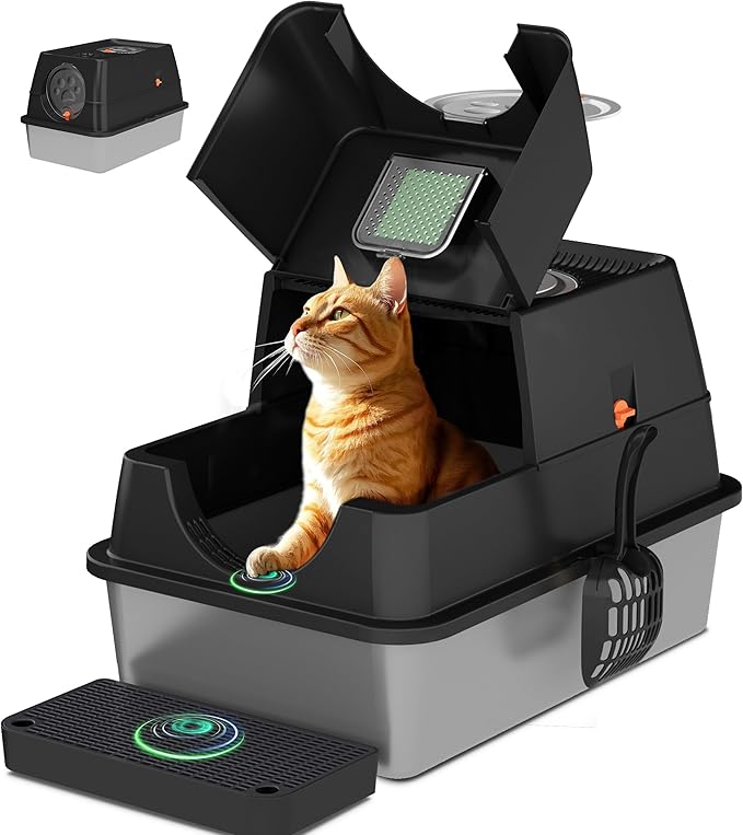 - 【100% Premium Thick Stainless Steel】Crafted from high-quality, rust-proof stainless steel, our cat litter box is designed to resist scratches and features a non-stick surface for effortless cleaning. Its durable structure is strong enough to support an adult's weight, ensuring long-lasting reliability and superior performance. The enclosed design includes carbon filters that effectively absorb odors, maintaining a fresh and comfortable environment for your cat.