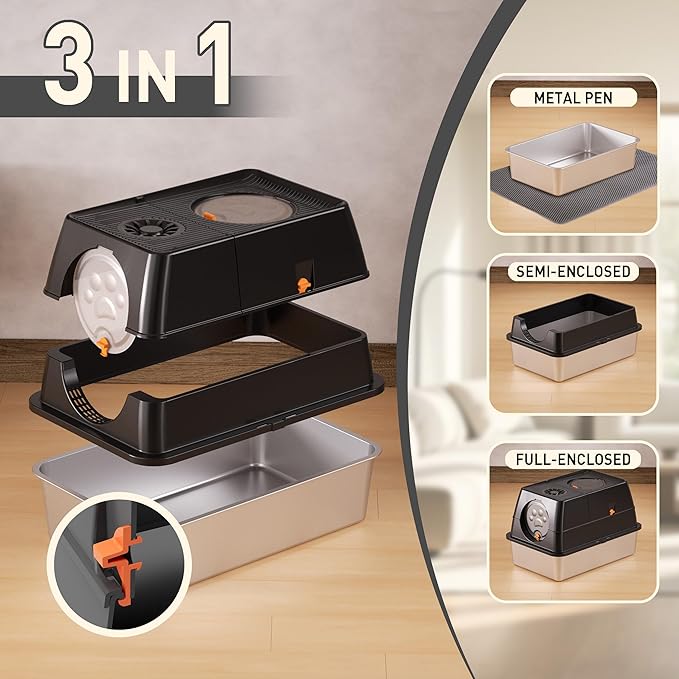- 【Integrated Enclosed & Dual Entry Mode】Designed with an easy-to-assemble modular system, this litter box supports both fully enclosed and semi-enclosed configurations to meet your pet's needs. Cats can enter through the front door and exit from the top lid, or use the top lid for both entry and exit. This dual-entry design helps prevent litter tracking and reduces mess, making it a convenient choice for pet owners.