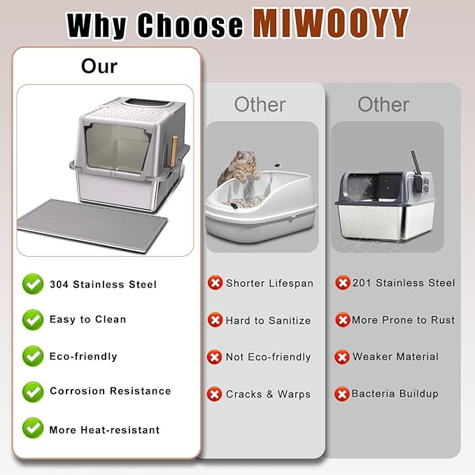 - 【 Heavy Duty 304 Stainless Steel 】: Made from premium 304 stainless steel, this litter box resists odors, stains, and rust—designed to last up to 10 years. The sleek plastic outer shell adds a modern touch and reinforces structural durability.