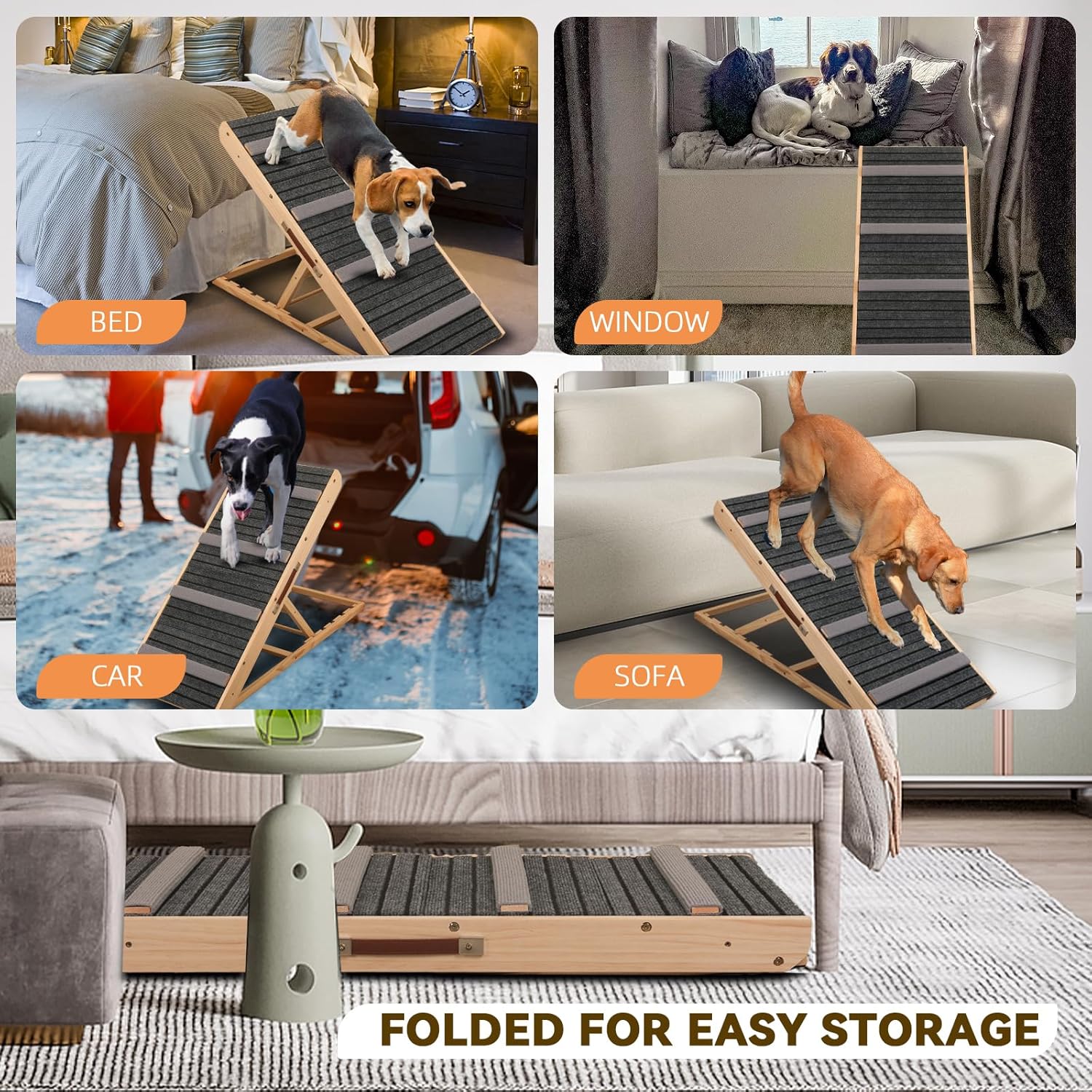- Comfortable & Non-Slip Surface: Carpet-covered steps and a grooved polyester ramp provide superior traction for paws, reducing the risk of slipping while ensuring a comfortable climbing experience for pets of all sizes.