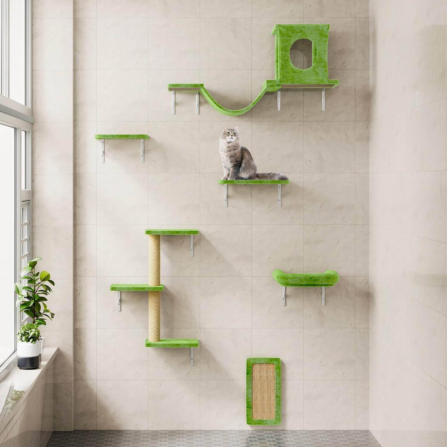 NUNU LAB Cat Wall Shelves, 6 Pcs Luxury Wall-Mounted Cat Climber Set, Indoor Cat Furniture with 1 Condos House, 2 Cat Wall Shelves, 1 Scratching, 1 Bridge Ladder, 1 Scratching Pad, Green