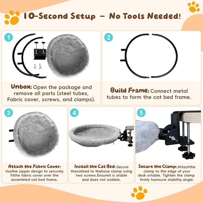 - Premium Cat Desk Bed Attachment – Heavy-duty metal clamps hold this desk mount cat bed securely (up to 50lb!), eliminating wobbles when your cat jumps in. Ideal for work-from-home pet parents needing a stable workspace.