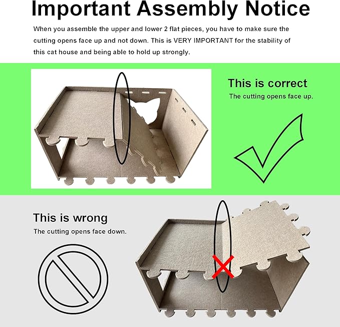 - EASY ASSEMBLY & EASY CLEANING: The assembly is very easy and straightforward with the interlocking design to ensure its stability. Make sure when you assemble this cat house, follow each step and the folding openings face the top to insure its stablility. At the same time, it's easy to clean using sticky rolls.
