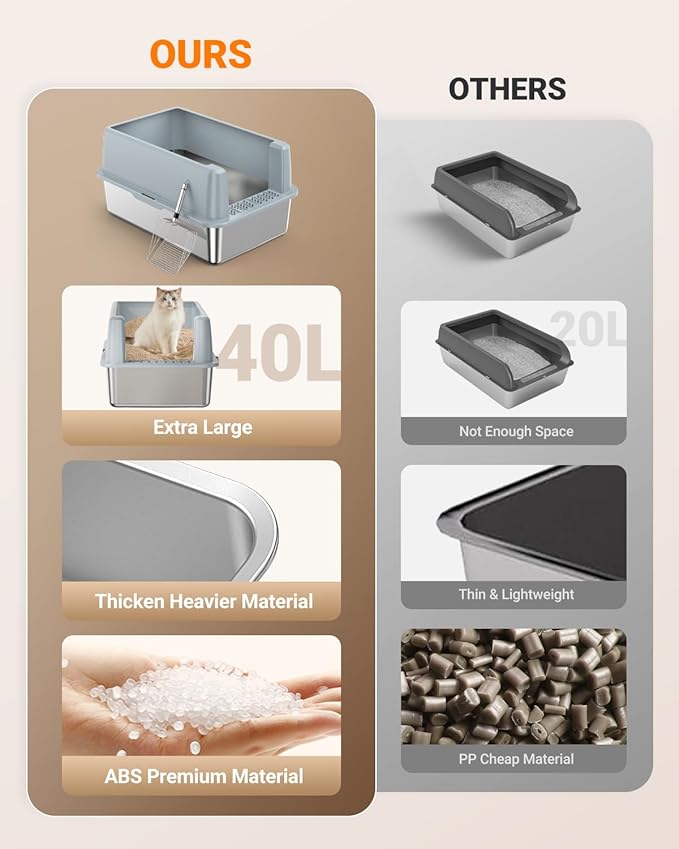 - 【Easy to Clean and Does Not Absorb Odors】: These stainless steel cat litter boxes usually have a smooth surface and non-stick coating, making it easier to scoop out clumps and keep the litter box fresh. Say goodbye to scrubbing and fighting stubborn residue, stainless steel cat litter boxes usually only require a quick wipe. Stainless steel remains relatively odor-free. This feature helps create a more comfortable environment for you and your cat.