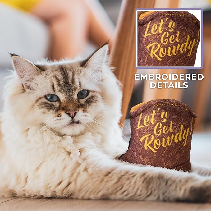 - Funny Parody Cat Toys: Whether your cat is a rodeo star or a brew aficionado, the Cats Blue Ribbon & Kitty Cowboy set delivers playful fun! Featuring a plush beer can and a bottle with feathers, plus a cowboy hat and boot with ‘Let’s Get Rowdy’ embroidery, these catnip filled cat toys make playtime extra entertaining.