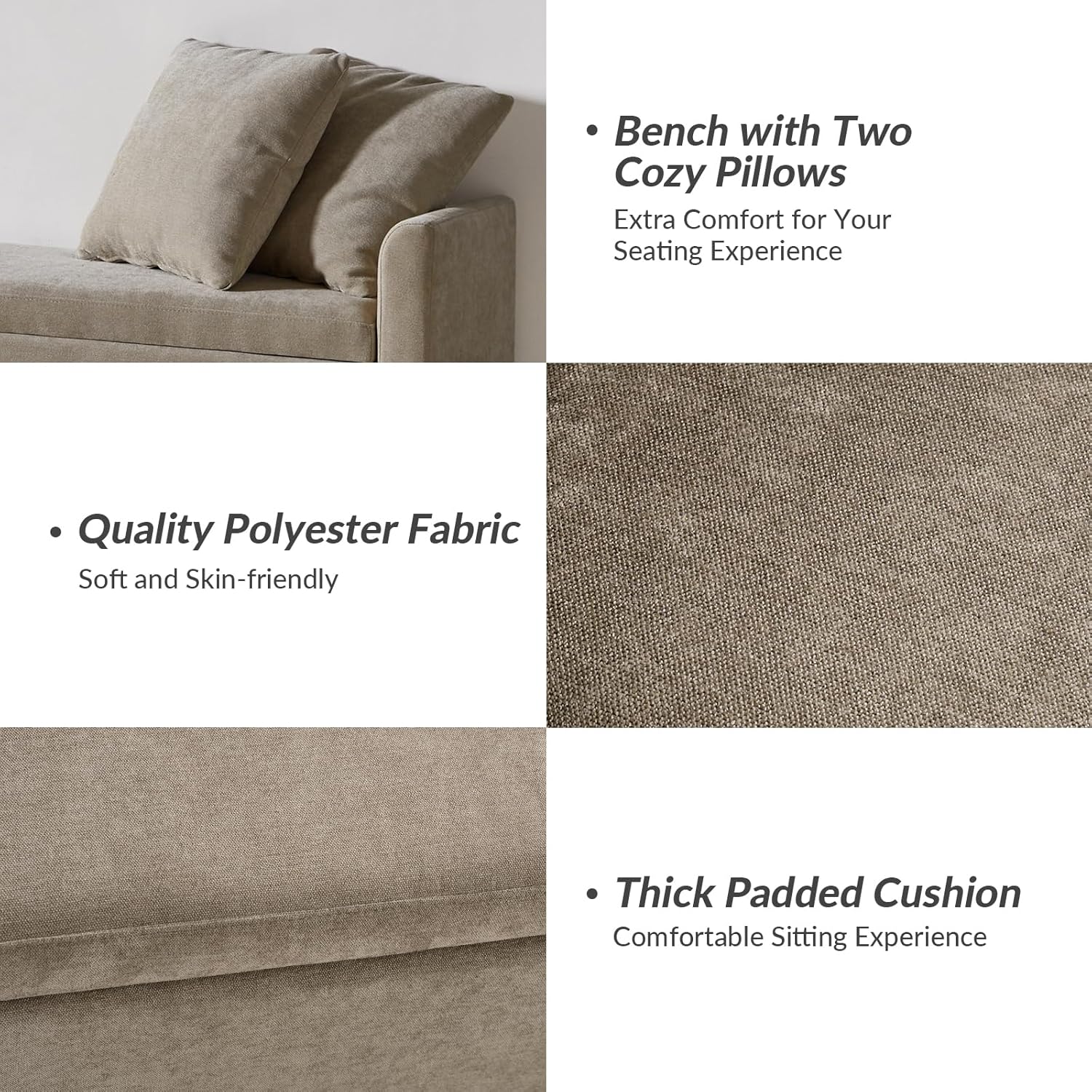 - Selected Material: Our end of bed bench is covered with 100% polyester fabric, breathable, smooth and skin-friendly. The inside of seat is filled with thick high-resilient sponge, which is not easy to deform after long-term sitting. Two throw pillows provides extra support and comfort.