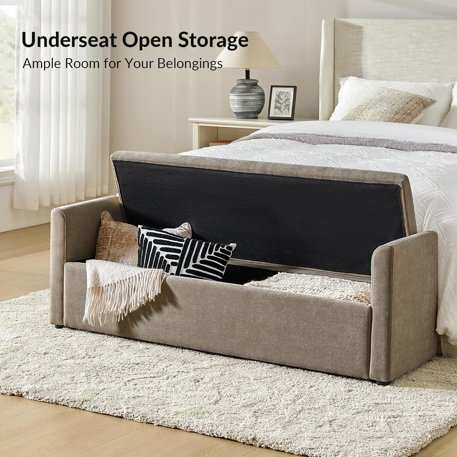 - Simplstic but Versatile: With a minimalistic yet refined structure, this storage bench brings out a simplistic style that emphasizes comfort and functionality. You can place it in the bedroom as a bed end bench, in front of the sofa in the living room as a footrest, or in the hallway as a shoe bench.