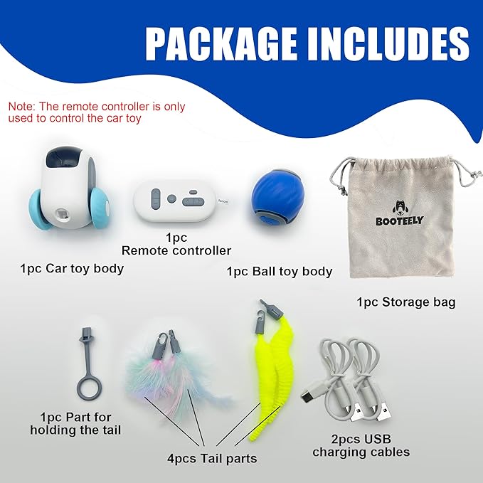 - What is in the cat toy pack: The set includes a interactive mice car cat toy with 2 types of feathers and a remote controller, a smart speedy sprint ball cat toy with 2 types of speedy tails, the charging cables, a specification, a storage bag and other parts. Both toys for cats and dogs are designed to make pets chase and hunt so that the toys can prevent boredom of pets, keep them busy, especially when the owners are not around pets