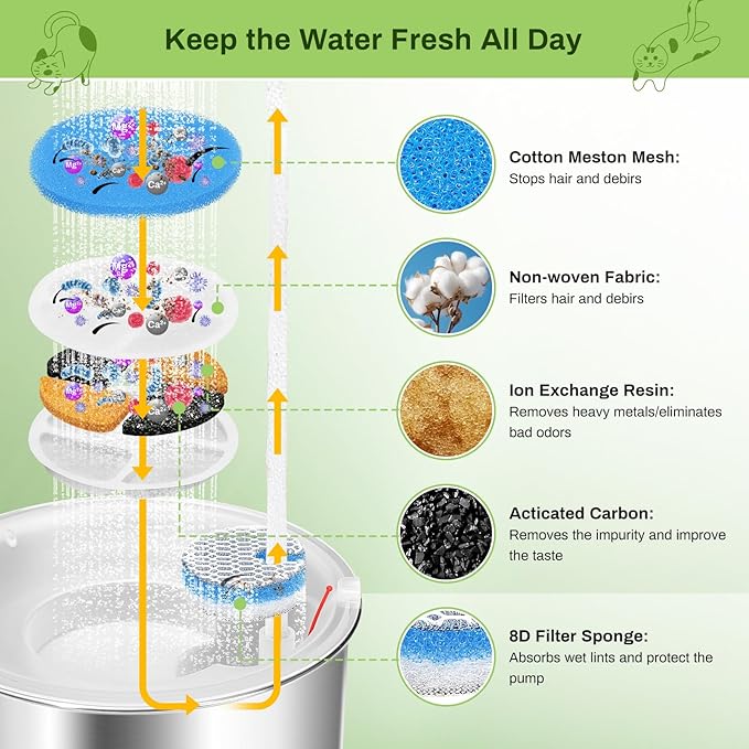 - Multi-Filtration System: this filter is composed of double-density filter, cation exchange resin, coconut shell activated carbon and cotton meston mesh. Selected high-quality materials, every drop of water is fresh and living water, so that your pets love to drink water;