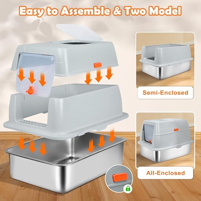 - PREMIUM STAINLESS STEEL - Made from ABS material and thickened stainless steel, this cat litter box is rust-resistant, scratch-resistant. Unlike plastic alternatives, it minimizes odors and keeps your space fresh. The stainless steel litter pan has a weight capacity of 110 lbs and lasts 3-5 years, reducing the need for frequent replacements