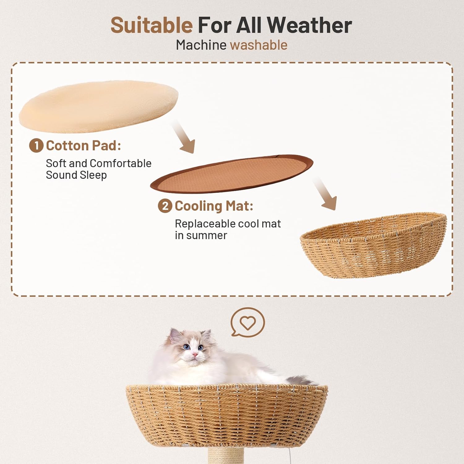 - All-Season Comfort for Your Cat:This cat tree tower features a breathable woven basket with two plush, machine-washable cushions—perfect for cozy naps year-round. In summer, switch to the cooling mat for a fresh, airy feel. Your indoor cats will love lounging in this ventilated hideaway, ensuring comfort in every season