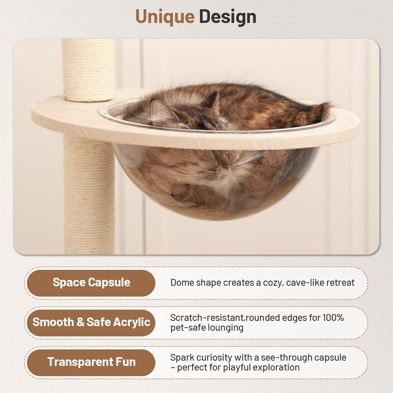 - Eco-Friendly & Durable Materials:Built to heavy-duty cat tree standards, our cat climbing tower uses 15mm thickened E1-grade particleboard (formaldehyde-free) and natural sisal-wrapped posts for safe scratching. The handwoven rattan nest is non-toxic and durable, while the smooth acrylic semi-circle adds a modern touch.