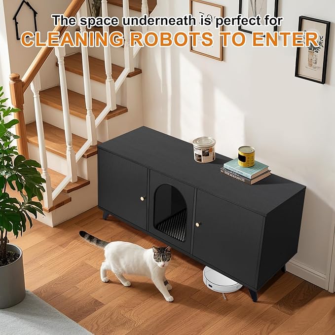 Cat Litter Box Enclosure for 2 Cats, Modern Hidden Litter Box Furniture with Double Room, Large Cat House Washroom Cabinet with Scratche Pad, 46.5" x 19.7" x 19.7" (Black)