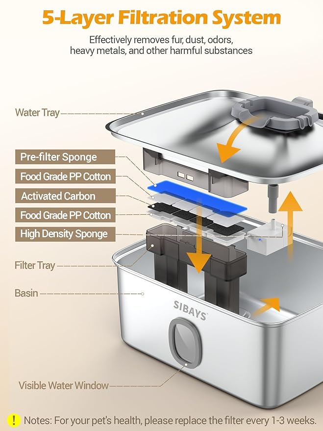 - 5-Layer Filtration System: The cat water dispenser features a 5-layer filtration system that includes pre-filter sponge, 2-layer PP cotton, coconut shell activated carbon, and a high-density pump sponge, which effectively remove hair, food residues, dust, odors, heavy metals from water, providing clean and fresh water for your pet.
