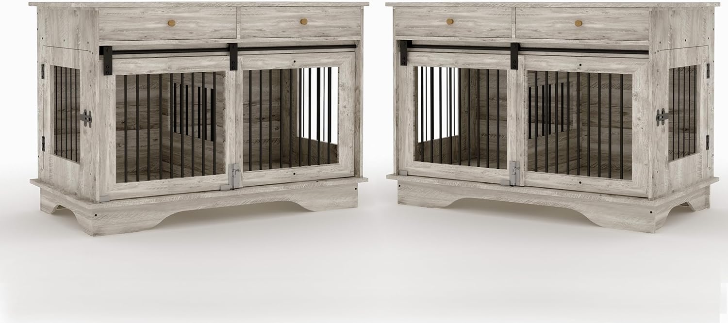 Dog Furniture Crate, 47" Large Dog Crate Furniture w/ 2 Storage Draws & Removable Divider for Large/Medium/Small Dogs (Grey, Double Cage)