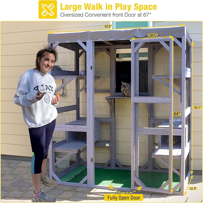- Walk In Style: Oversized convenient front door at 64" with safety latch allows adult people to access the cat enclosure to interact with the pets, while making cleaning easier