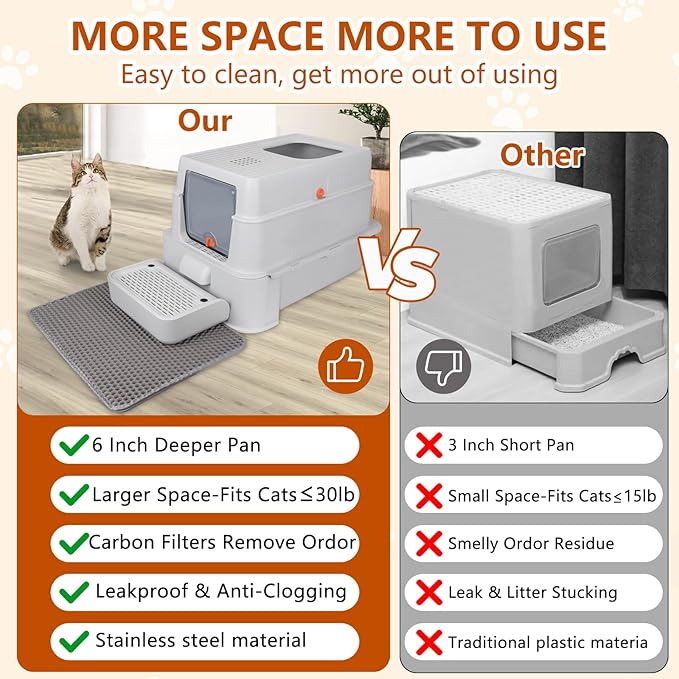 - 【5.9 Inch Deeper Pan Litter Box】This 5.9inch stainless steel pan is deeper 60% than others short pan that about 3inch deep.Deeper pan can hold more cat litter and you don’t need to refill litter frequently.Using this stainless steel litter box,there will be no litter clog and urine leakage through gaps.