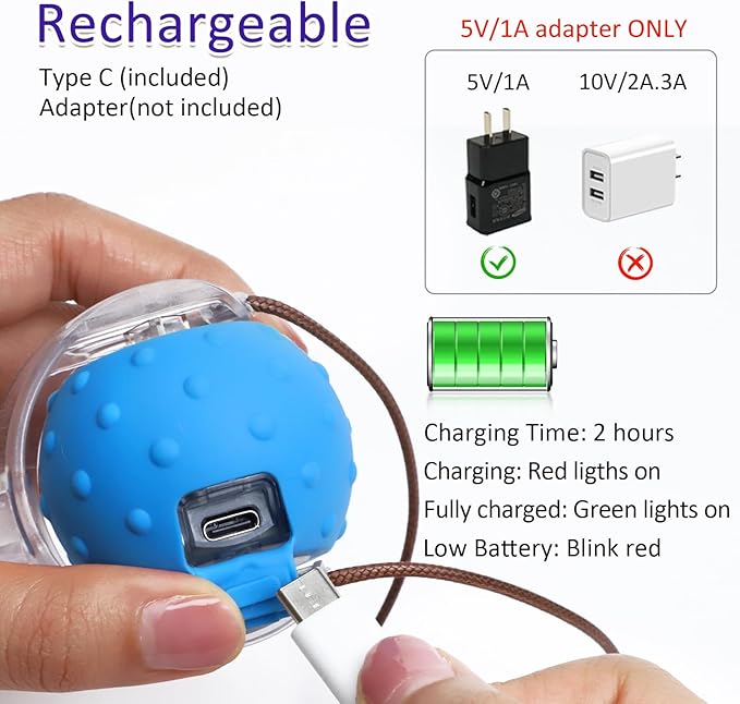 - IMPORTANCE TIPS OF CHARGING - 5V/1A Adapter Only. Giociv cat ball works 5 minutes and goes into sleep mode if cats aren't playing with it and wakes up once (after 2h) in while to see if they are now interested