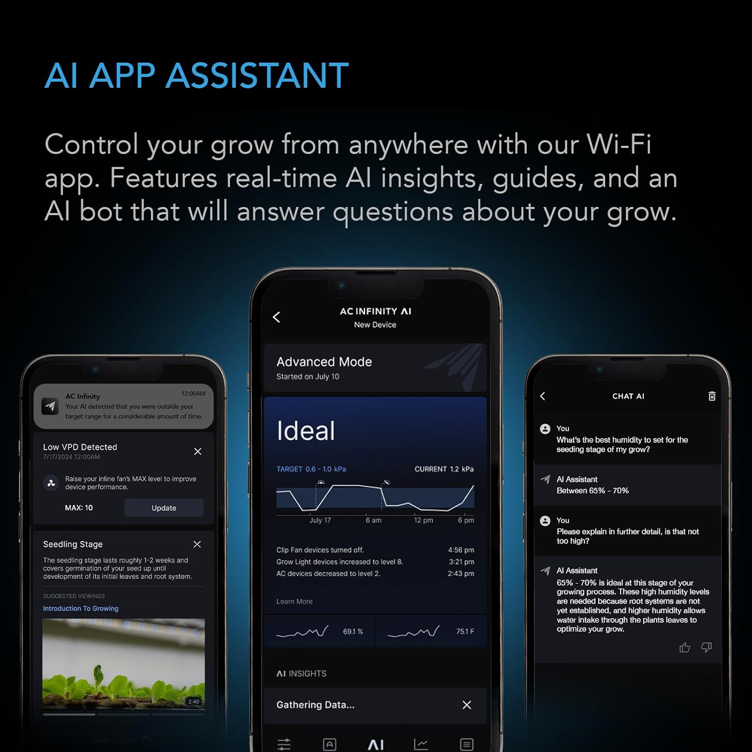 - Control your setup from anywhere via WIFI with our app, featuring real-time AI insights, guides, alerts, charts, and the ability to chat with our AI bot about your grow.