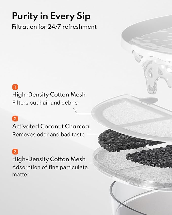 - Triple Filtration Pet Water Fountain - Activated carbon, ion-exchange resin, and a high-density sponge work together to eliminate fur, dirt, and odors. Say goodbye to “black chin” and hello to fresh, vet-approved hydration!