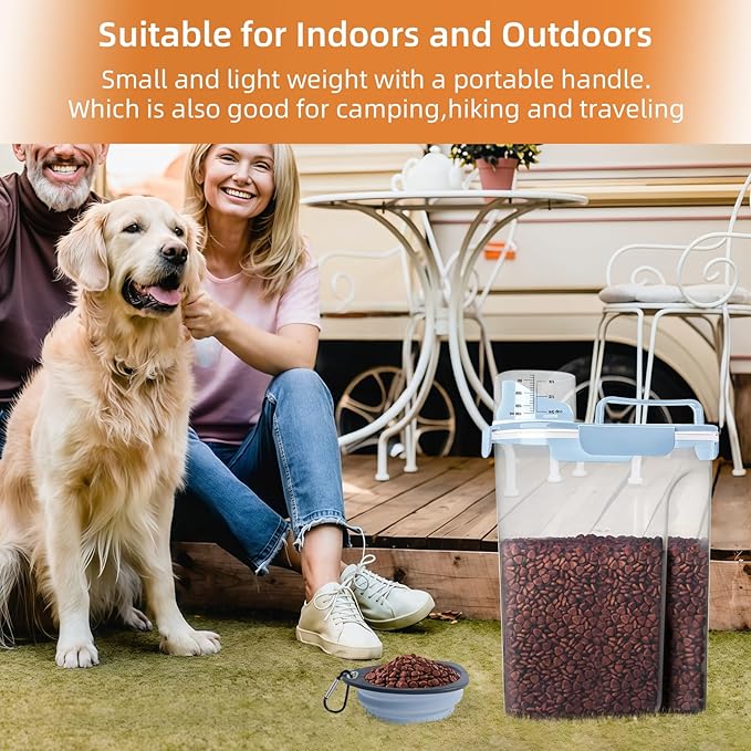 - FUNCTION : This airtight dog food container with portable handle has an airtight design,-has 2 silicone seals and 4 sealing buckles,which can keep your food dry and fresh, the portable handle and large spout design can easily Easily pours food out,also perfect for traveling, hiking, camping or picnicking with your dog