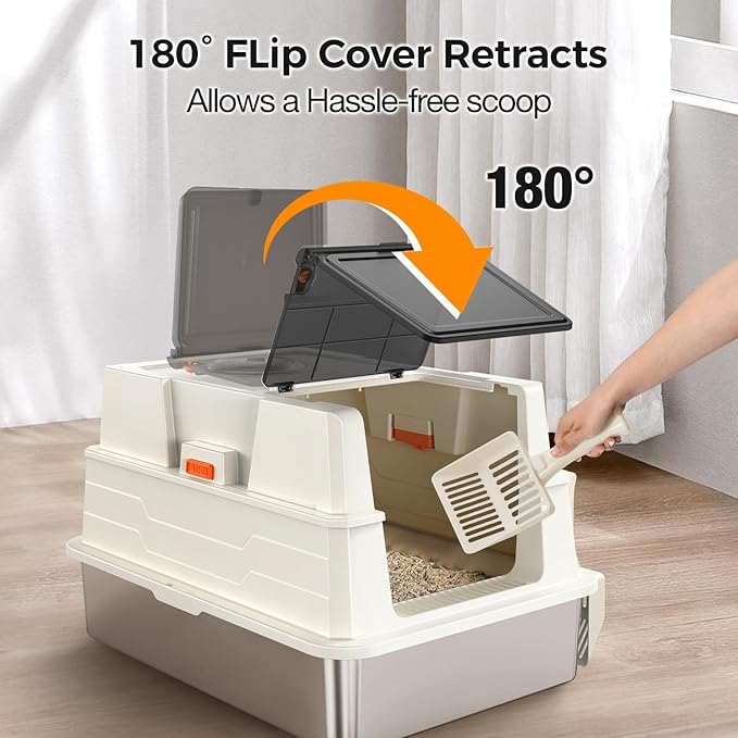 - Effortless Cleaning with Flip-Open Door:The extra large litter box with unique 180° flip door allows quick scooping without removing the lid. Smooth non-stick surface wipes clean in seconds