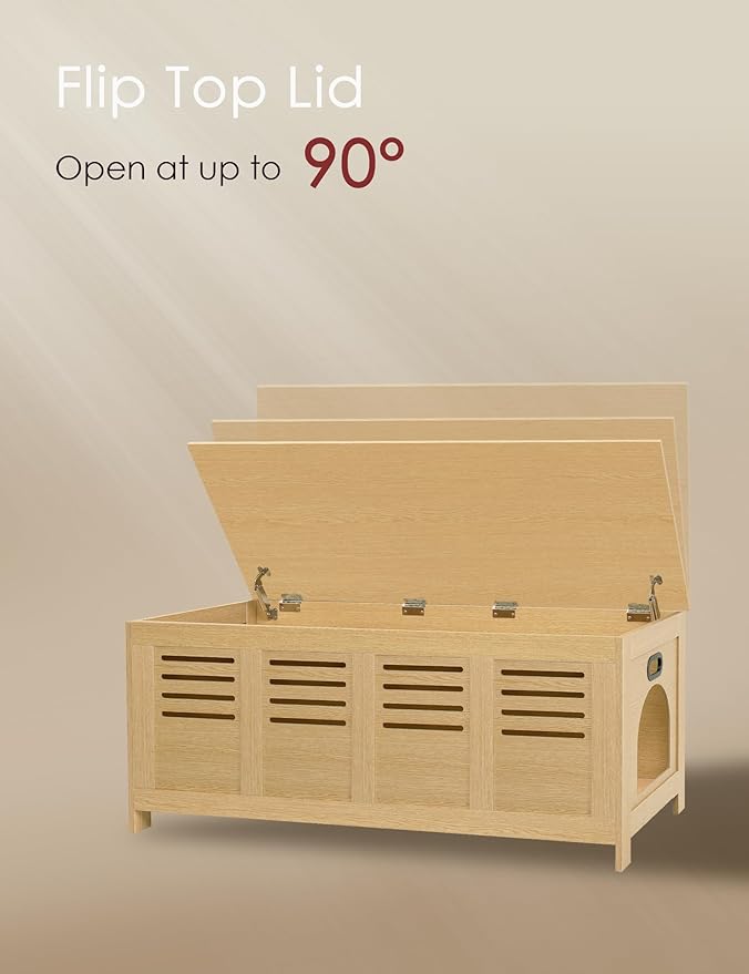 - 【High-quality Materials】The hidden litter box enclosure is made of solid particle board for safe and durable. An extra support leg is set at the bottom to enhance the firmness and stability. Flip top lid is equipped with 2 safety hinges which can stop at any position, effectively prevent cats from opening the door by mistake