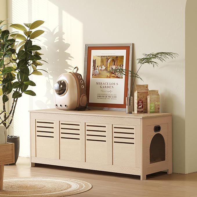 - 【All-in-1 Pet Furniture】As a cat litter box enclosure, it perfectly hides odors and scattered cat litter. As a cat house, it provides your cats a private and secure place. It can also be used as a storage cabinet to store cat supplies. Spacious top space can be used as a side table or bedside bench