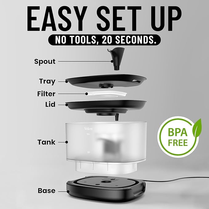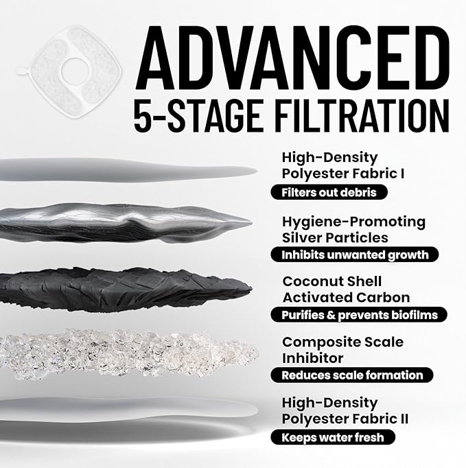 - Advanced 5-Stage Filtration: Our fountain features a 5-stage filtration system with upgraded materials, including silver, composite scale inhibitors, and activated carbon. This combination ensures your pet has fresh and pure water for up to 3 weeks. Note: Clean the filter and the fountain every 2 weeks to prevent debris buildup that may lead to overflow.