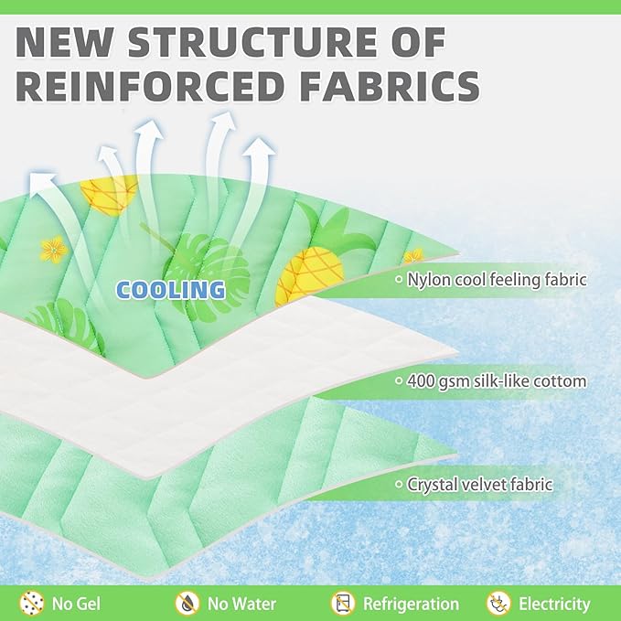 - HIGI-QUALITY MATERIAL: The top layer is made of 100% nylon cooling fabric, providing a lightweight and breathable feeling, and keeping cool. The 400g thick absorbent cotton in the middle quickly absorbs moisture, keeping the surface dry, and the thicker design increases comfort. Our cooling pads are safe and durable, requiring no water, electricity, or refrigeration to provide excellent cooling - cool but not freezing. For extra coolness, it can be used with air conditioning or a fan.