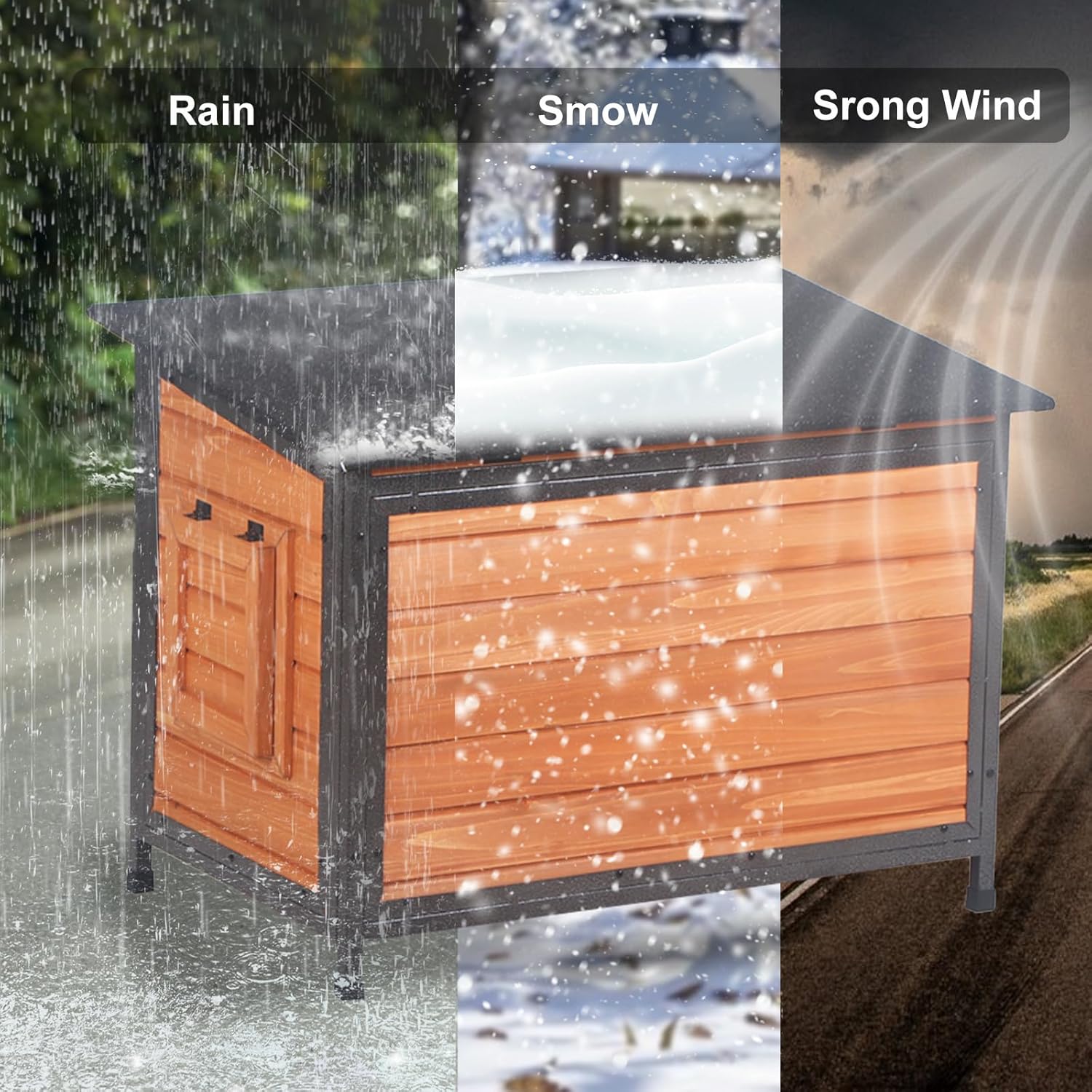 - Weatherproof & Durable Build: Designed for year-round outdoor use, this dog house outdoor combines a UV-resistant asphalt roof with thick, interlocked cedar-plywood-foam panels. The sloped roof and elevated base prevent water pooling, while sealed joints and a water-repellent coating shield against rain, snow, and humidity