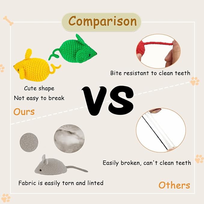 - 【Bite-resistant material】The cat toy mouse outer layer is made of braided wool, handmade sewing process, no risk of falling off small accessories, the inner filling of high elasticity cotton, which can bear repeated scratching and biting by cats
