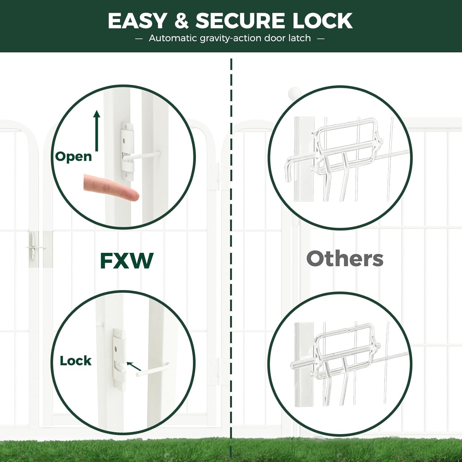 - Unlock your freedom, savor the moment: The stakes are designed with rounded ball tops to protect the dog's claws from injury. The rods are easily inserted into the ground for greater stability and rigidity, which won't collapse when the dog leans against them. Also, the automatic gravity-actioned locking mechanism will ensure you can open and close the door smoothly and reduces the chance of dogs unlocking by themselves. All of this is designed for absolute safety, so you can really relax.
