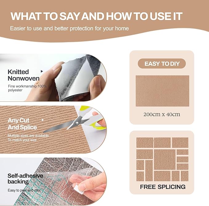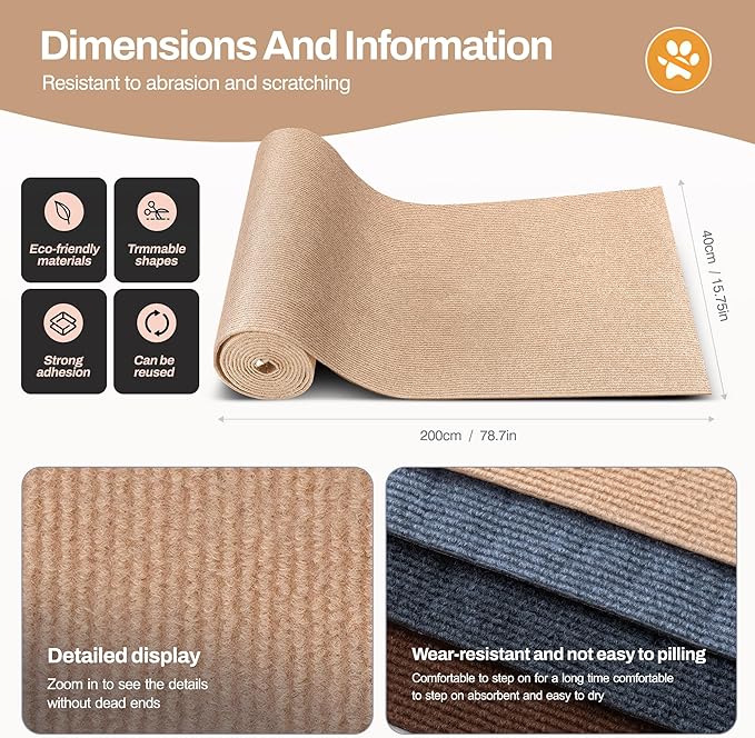- 【Self-Adhesive Convenience】This cat carpet mat is designed with a self-adhesive backing that is securely fastened using an environmentally friendly adhesive. Simple to install, simply peel off the backing and stick it to the desired surface to ensure a secure, hassle-free fit and maintain a firm grip.We also have additional eco-friendly adhesive and screw nails to help you better choose the scenarios you want to use.