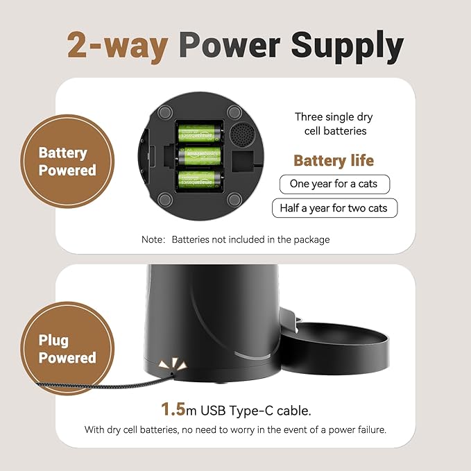 - Dual Power Supply: Never worry about power outages again. This pet feeder is equipped with a dual power supply system, and supports AC power and batteries(Not included) as backup, Even if there is a power outage, the pet feeder can still continue to work with the battery to ensure that your pets can eat on time