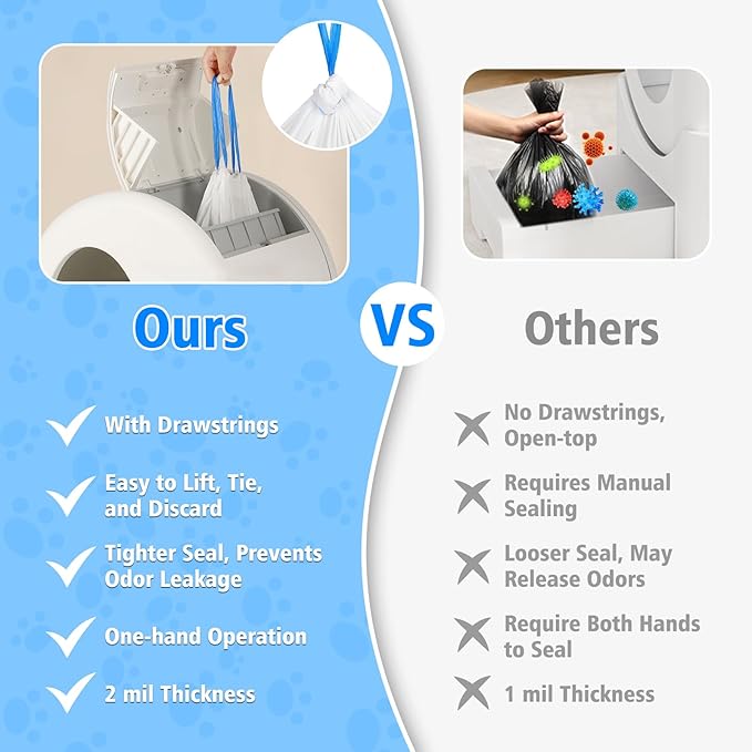 - No-Spill Drawstring System: Reinforced drawstrings on these cat litter box liners create an odor-proof seal with one pull. These cat litter bags for automatic litter box simply pull, lift, and seal to prevent spills and odors—keeping your hands clean and making disposal quick and hygienic. Perfect for self cleaning cat litter box setups and for MeoWant litter box waste drawers.