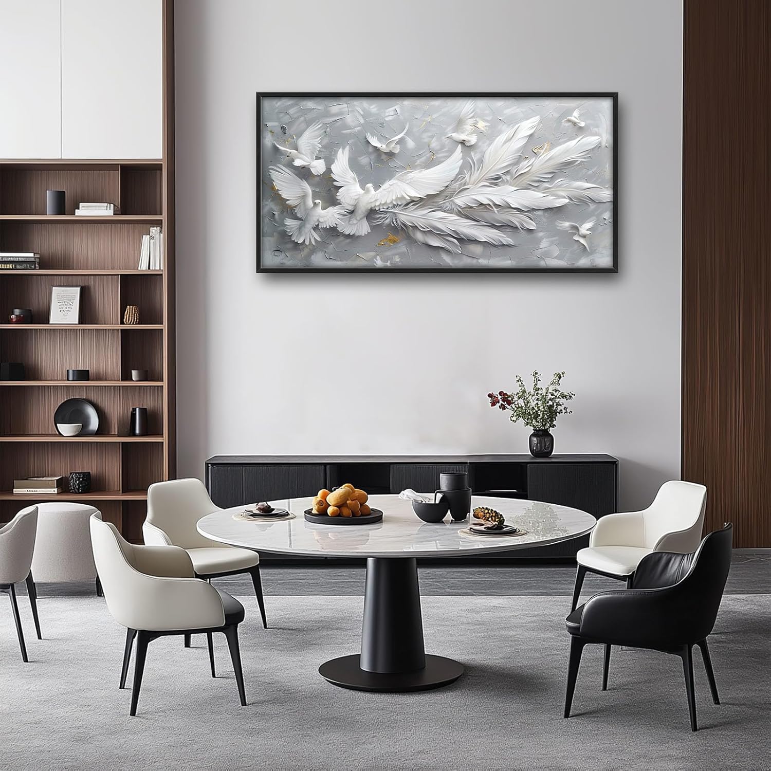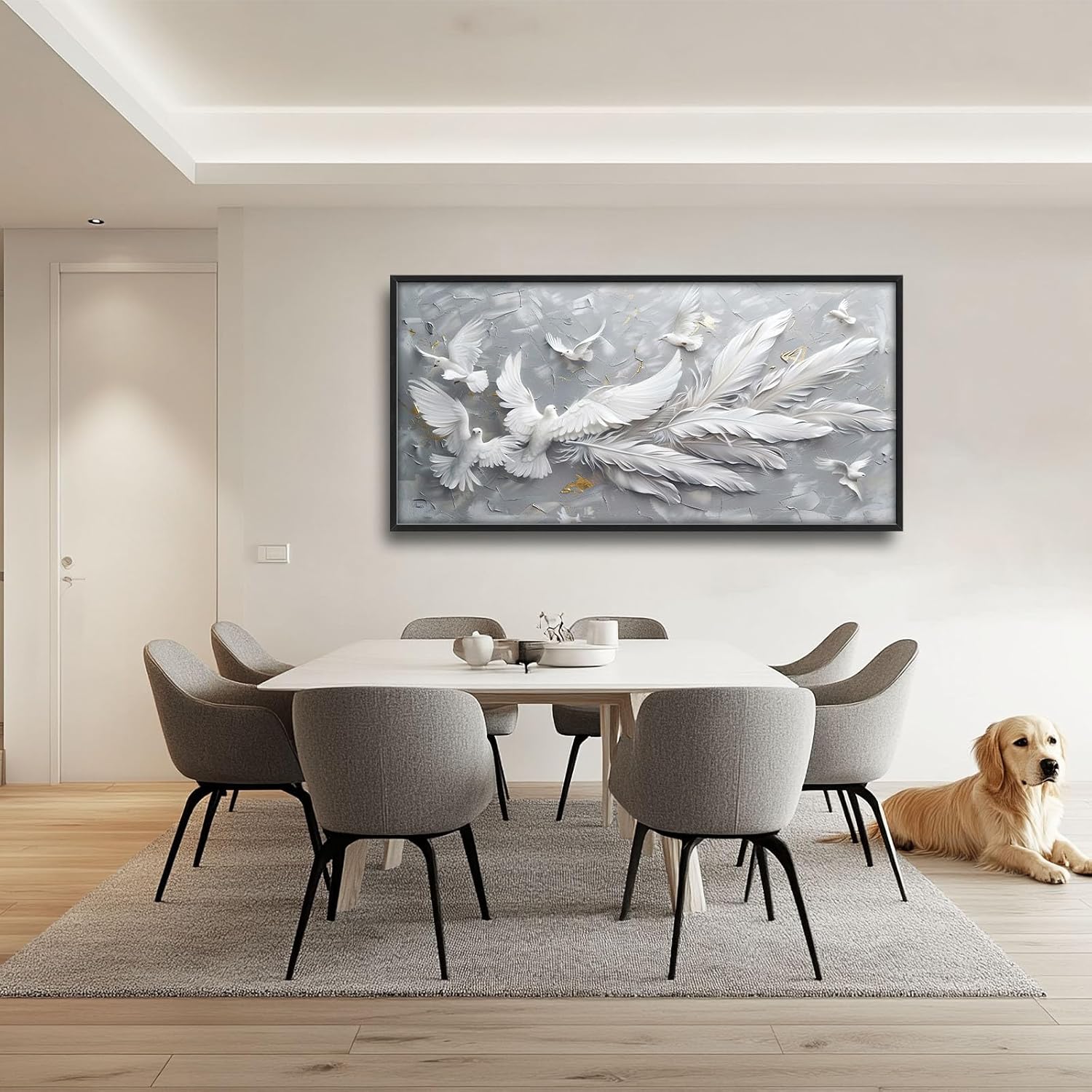 - 【Unique Design】3D abstract painting of white doves with long feathers, flying in the air. The background is gray and textured. There should be no shadows on it. In front, there will also be other light-colored birds, and they can have different shapes. Together, they form an artistic composition that symbolizes peace or freedom. White feathers on wings, full-length, high detail.