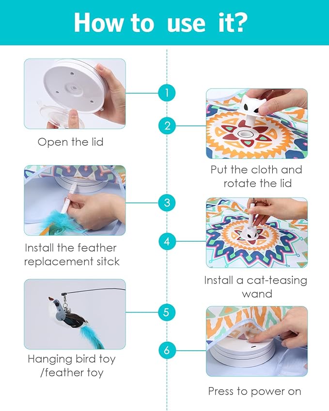 - 【Multi-functional Accessories】The automatic cat toy include 1 teaser wand, 1 bird pendant, 1 pendant feather, and 2 replaceable feathers. You can swap them according to your pet's preferences. The four corner star shaped double layer detachable cover cloth is easy to clean and doesn't take up much space when stored, keeping your home tidy