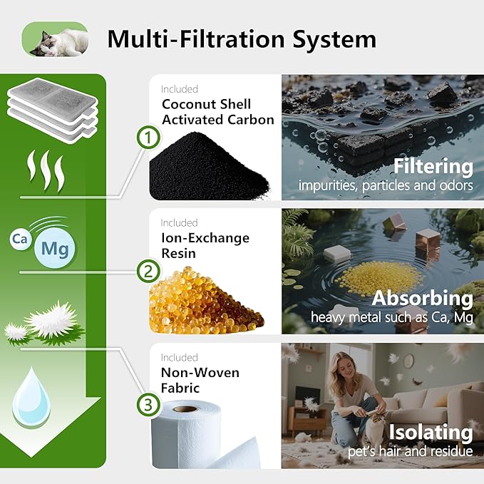 - Advanced Filtration: The outer surface material of the filters for cat water fountain is non-woven fabric, which is filled with high-quality coconut shell activated carbon, effectively isolating cat hair and food residue, removing impurities, particles, heavy metals, and odors, and softening tap water to provide clean and fresh water. This enhances water quality and increases your pet water intake, maintaining their health and vitality