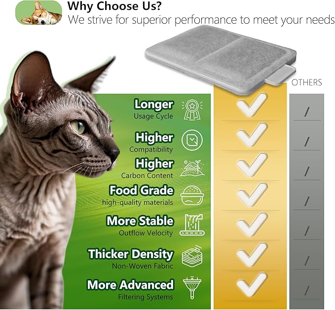 - Advanced Filtration: The outer surface material of the filters for cat water fountain is non-woven fabric, which is filled with high-quality coconut shell activated carbon, effectively isolating cat hair and food residue, removing impurities, particles, heavy metals, and odors, and softening tap water to provide clean and fresh water. This enhances water quality and increases your pet water intake, maintaining their health and vitality