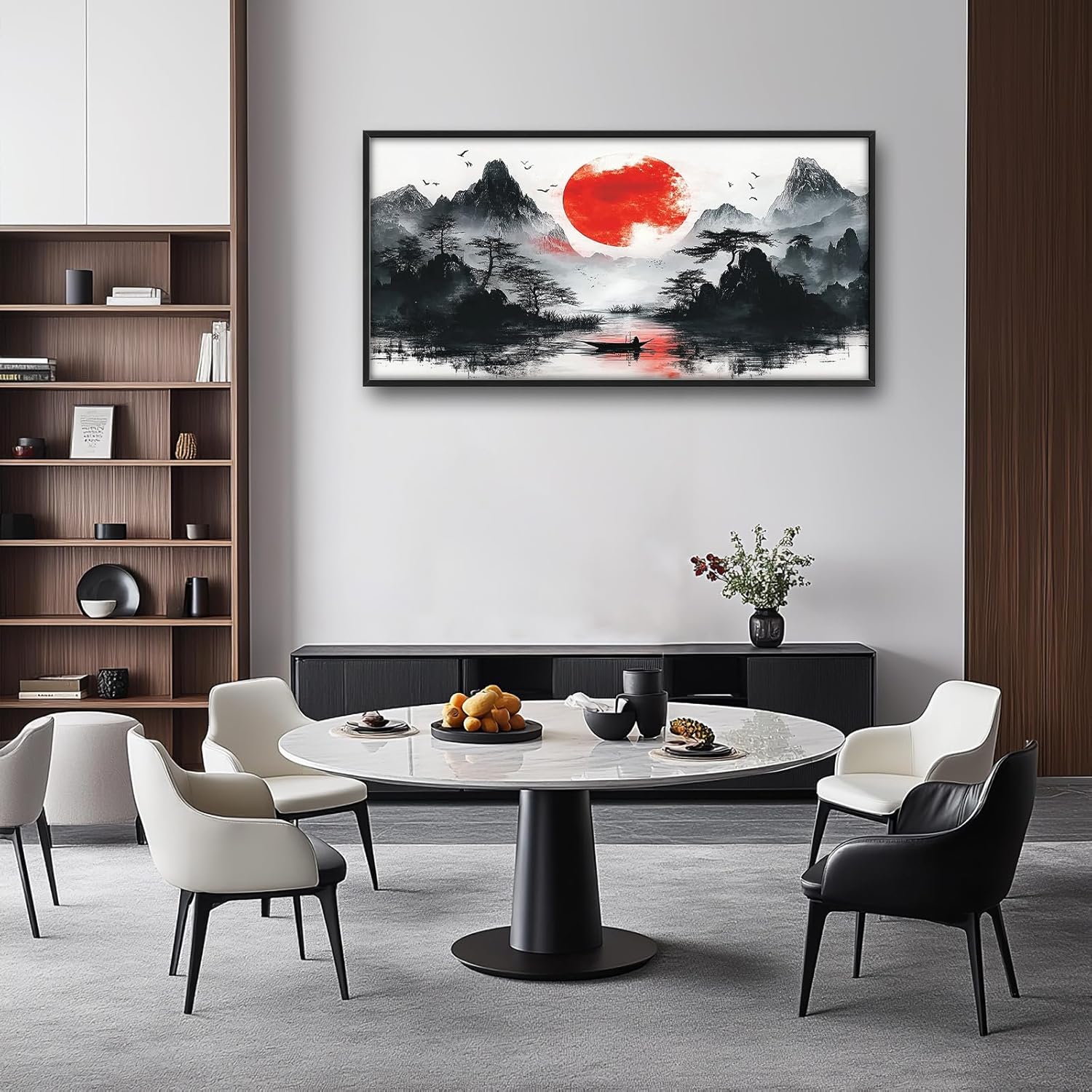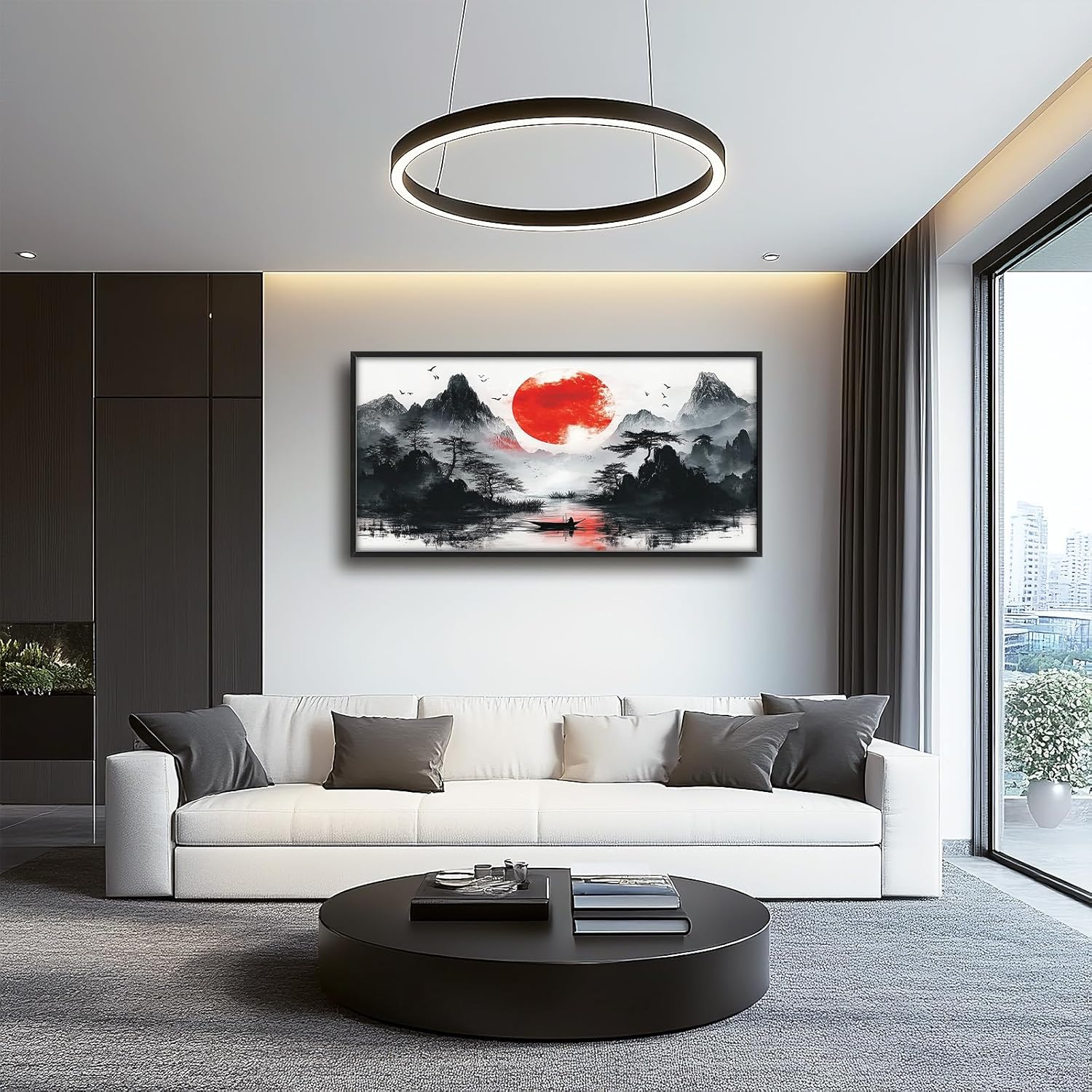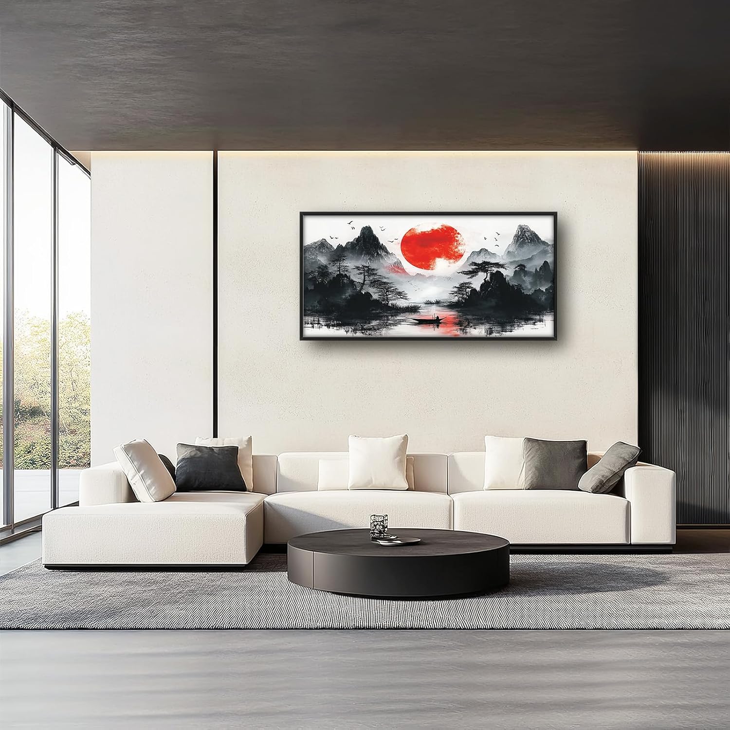 Framed Large Japanese Mountain Wall Art for Living Room, Oversized Asian Red Sun Lake Landscape Wall Decor Nature Canvas Painting Home Decoration for Living Room Bedroom Office 60"x30"